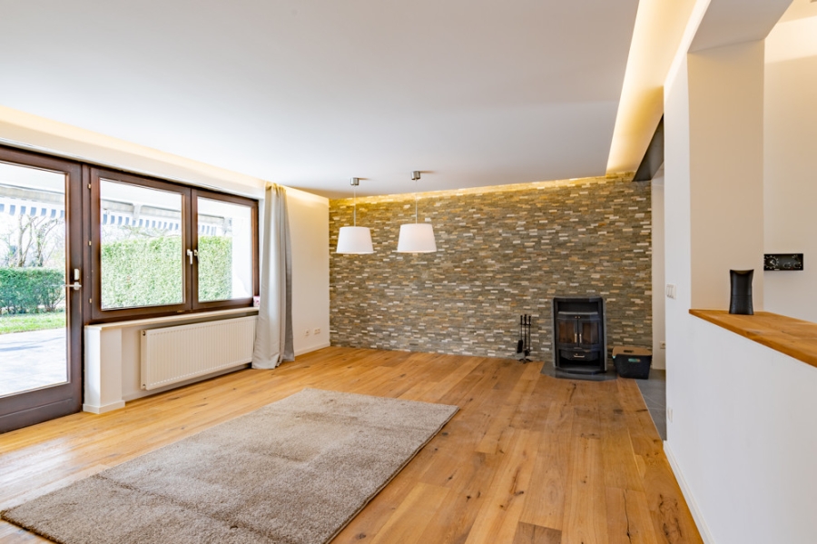 Schon beim Betreten dieses Bungalows fällt der Blick auf die hochwertige Ausstattung. Rechts von der Eingangsdiele befinden sich das Gäste-WC. In Richtung offener Wohnbereich kommt man direkt an der Küche vorbei. Hierbei handelt es sich um eine weiße Miele-Einbauküche mit Siemens-Elektrogeräten die sogar das Herz eines Profi-Kochs höher schlagen lässt. Neben der offenen Design-Küche erwarten Sie hochwertigste Designer Bäder und das modernste Elektro-, Technik- und Lichtkonzept im gesamten Bungalow. Der traumhafte Garten auf begehrter Sonnenseite punktet mit faszinierendem Ausblick ins Grüne und lädt Sie morgens zu einem romantischen Frühstück, sowie abends zum gemeinschaftlichen Grillen mit der Familie und Freunden ein. In den kalten Stunden des Winters sorgt der Kamin für eine gemütliche Atmosphäre - hier kann man im geschmackvollen Wohnbereich die Seele baumeln lassen.