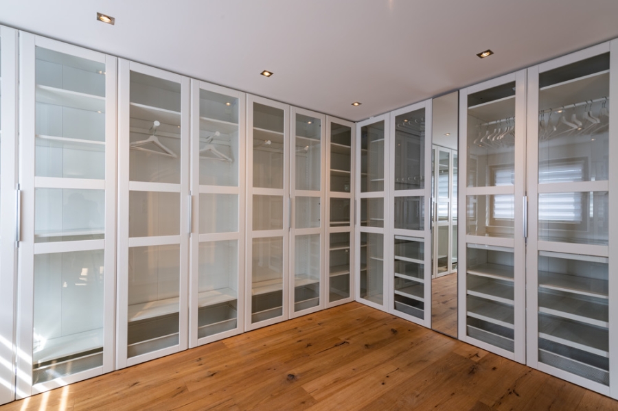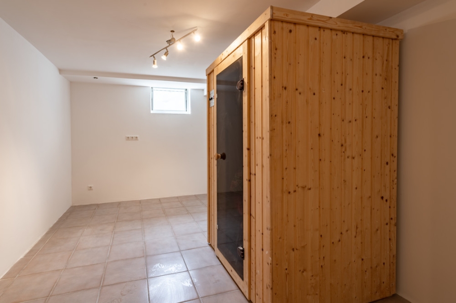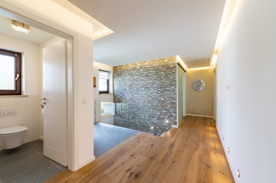 Links vom Eingangsbereich gelangt man über den langen Flur entlang in das vollausgestattete Designer-Badezimmer und das Master-Bedroom mit maßgefertigen Ankleidezimmer. Der hoch ausgebaute Vollkeller bietet zahlreiche weitere Schlafzimmer sowie ein Wellnessbereich mit Sauna, ein Hauswirtschaftsraum und der Heizungsraum. Diese Liegenschaft begeistert in jeder Hinsicht und bietet einen idealen Rückzugsort für die ganze Familie.