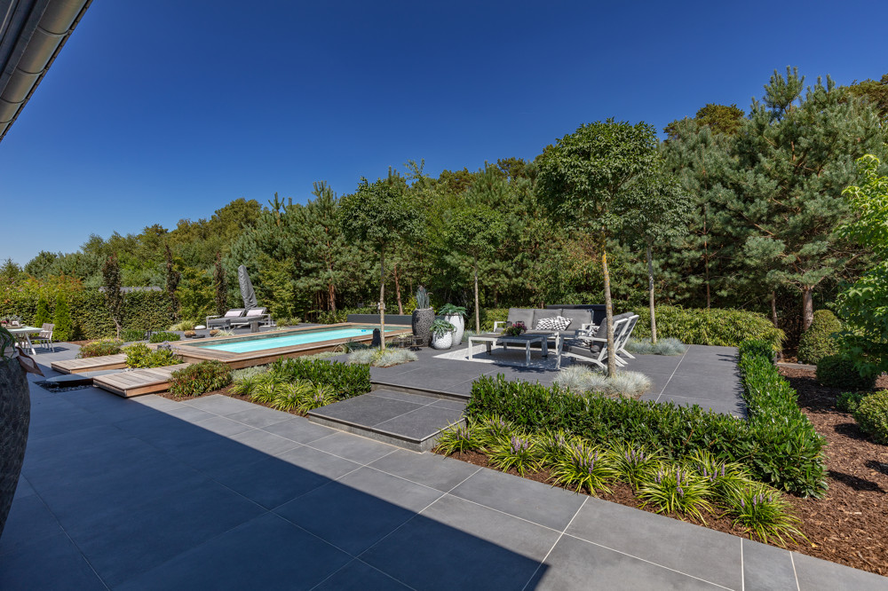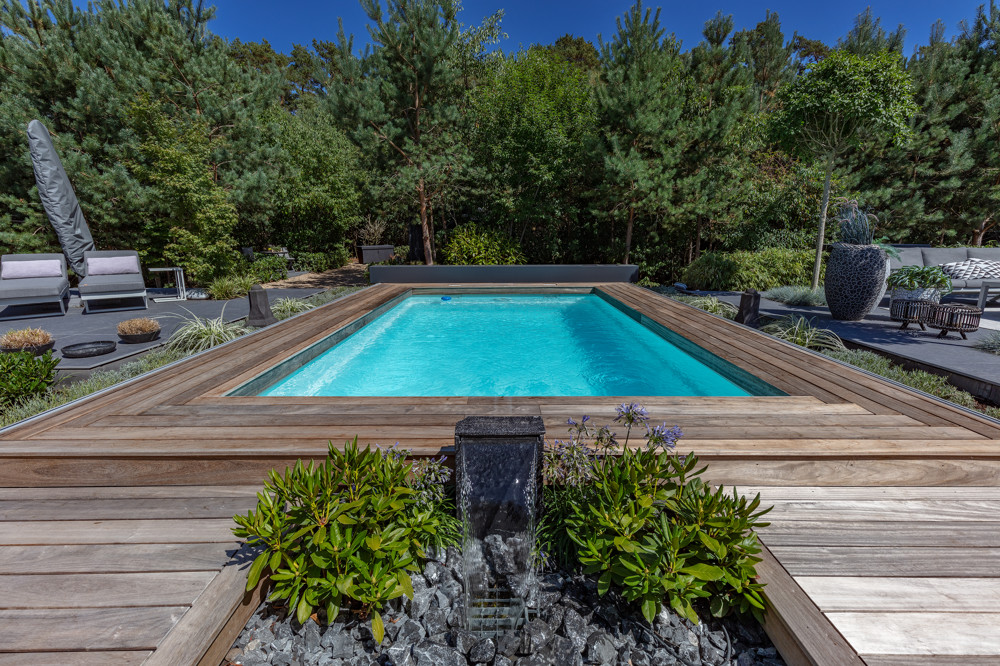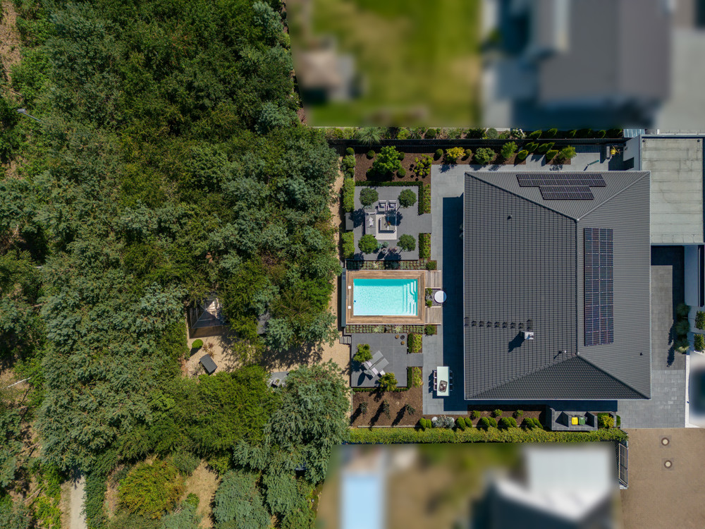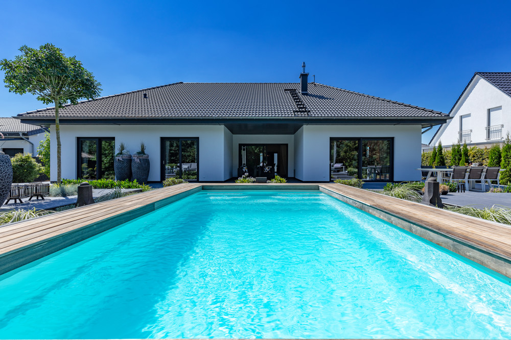 Ein Highlight ist der eingebaute, von Holz umrandeter Pool: Mit breitem Stufenzugang, automatischer Rollabdeckung, Beleuchtung und Beheizung wird er höchsten Ansprüchen gerecht.