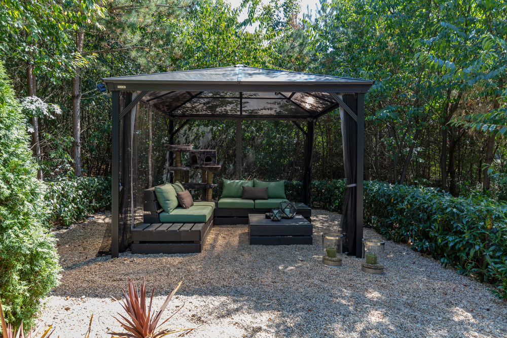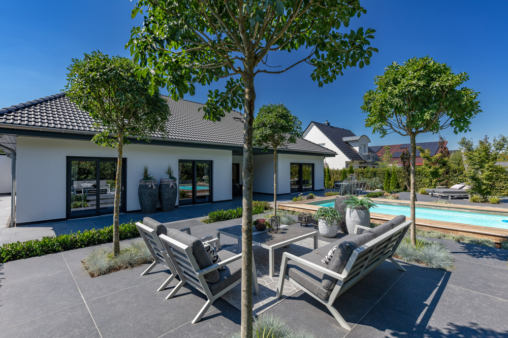 - Angelegter Außenbereich mit Bewässerungssystem und Beleuchtungskonzept