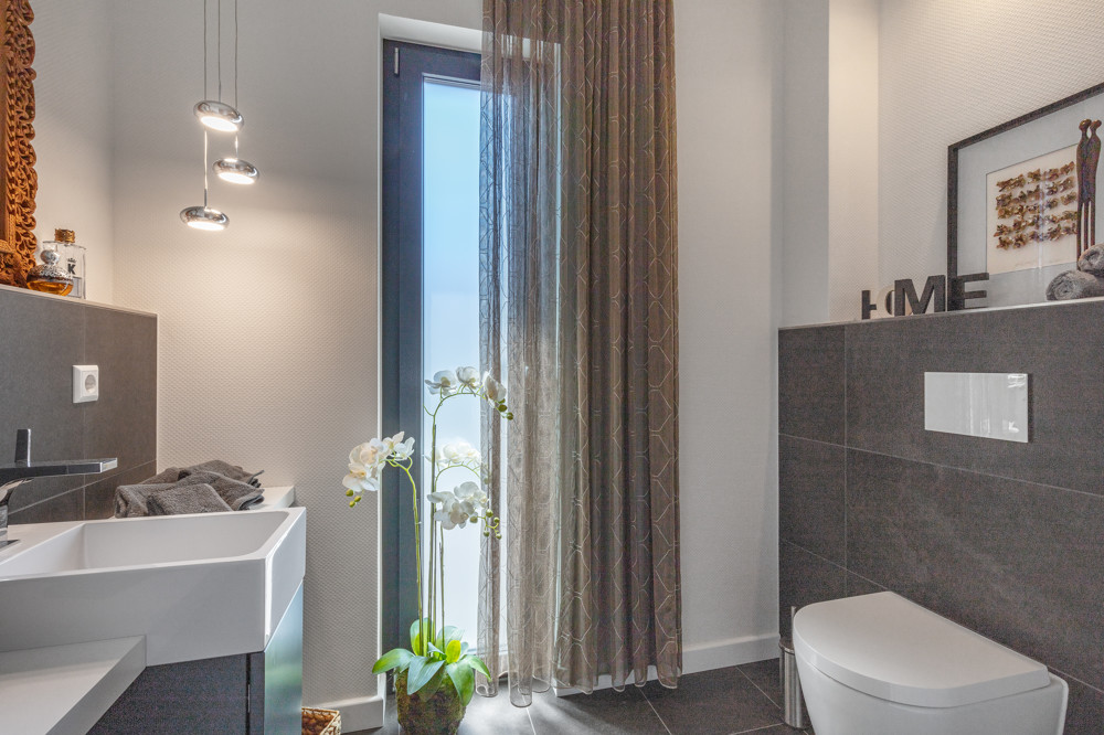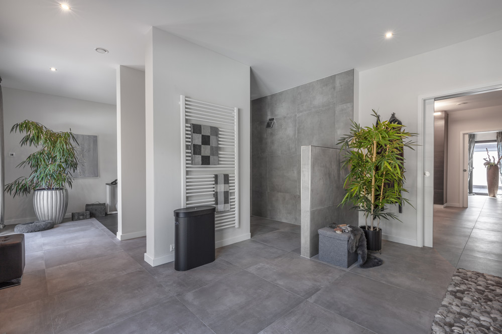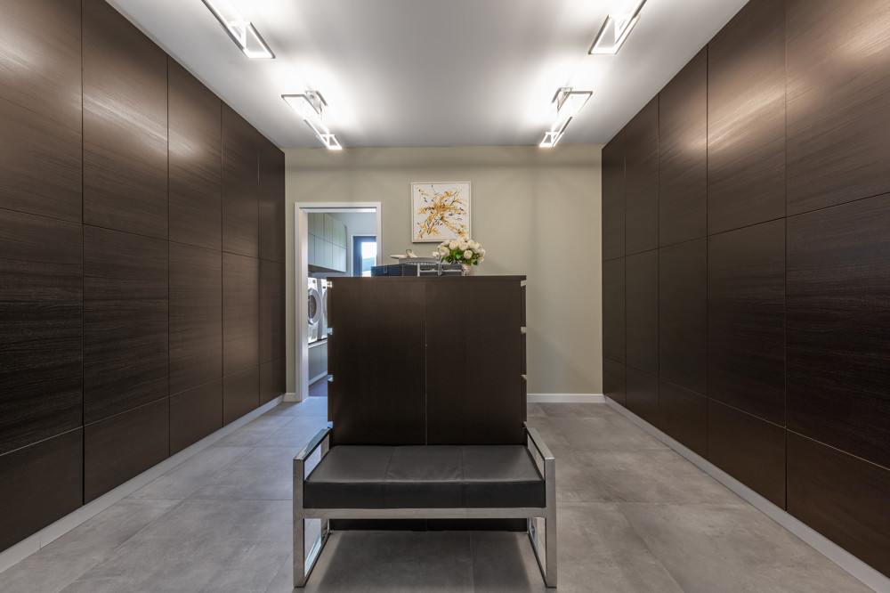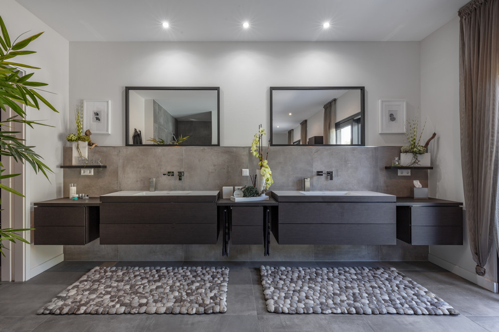 Ein weitläufiges Bad mit bodengleicher Walk-in-Rainshower Dusche, Doppel-Waschtisch, separat abgeteiltem WC und praktischen Schrankeinbauten sowie ein Hauswirtschaftsraum mit Abstellmöglichkeiten komplettiert diese Ebene.