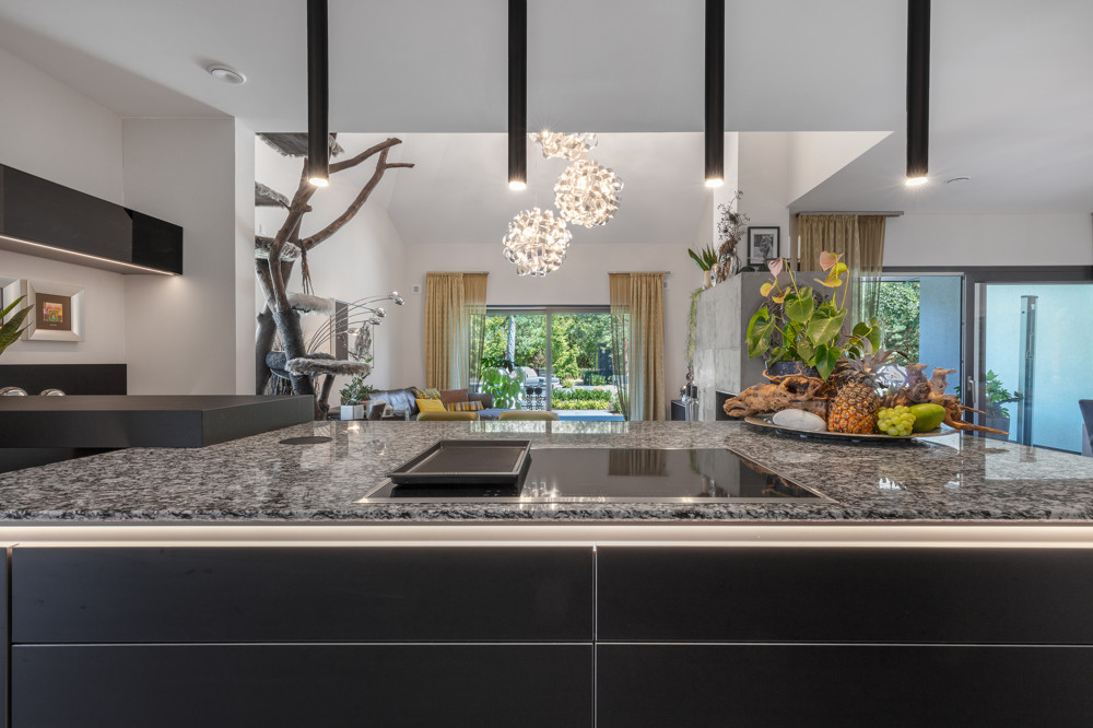 Ein offen gestalteter Durchbruch führt in das Herzstück des Erdgeschosses, einen weitläufigen Wohn-/Essbereich mit anschließender, offen gestalteter Küche. Im Wohnzimmer bildet ein moderner Panoramakamin mit dreiseitigen Wandnischen einen Blickfang und sorgt für Behaglichkeit. Große Glasfronten mit optimaler Nord-Ost Ausrichtung geben den Blick auf die Terrasse und den Pool sowie in den Garten frei.
