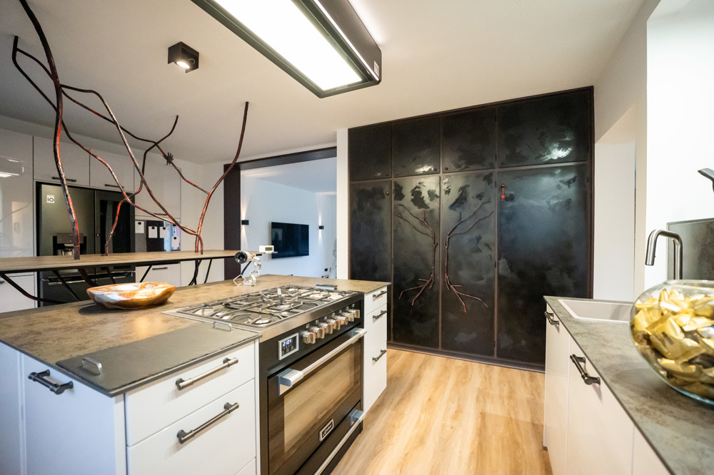 - Hochwertige Neff-Küche mit schwarzen Designelementen, Echt-Keramikplatten, Einbaukühlschrank und separaten Designerschränken in Matt-Schwarz Optik