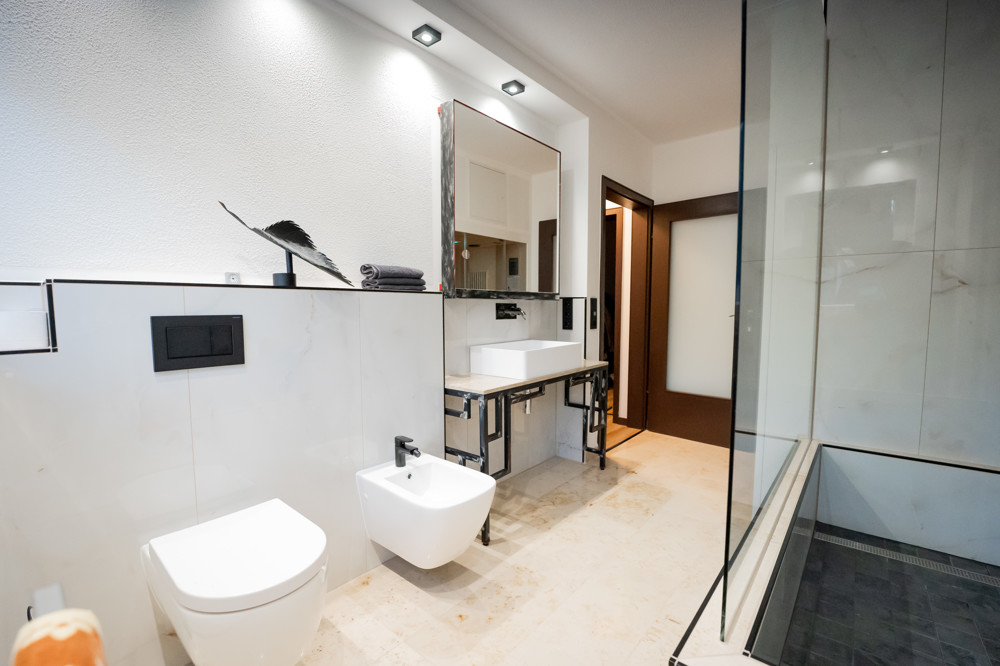 - Duschbad im 1. Obergeschoss mit Regendusche, Sauna, gezielt platzierten LEDS und Bidet.