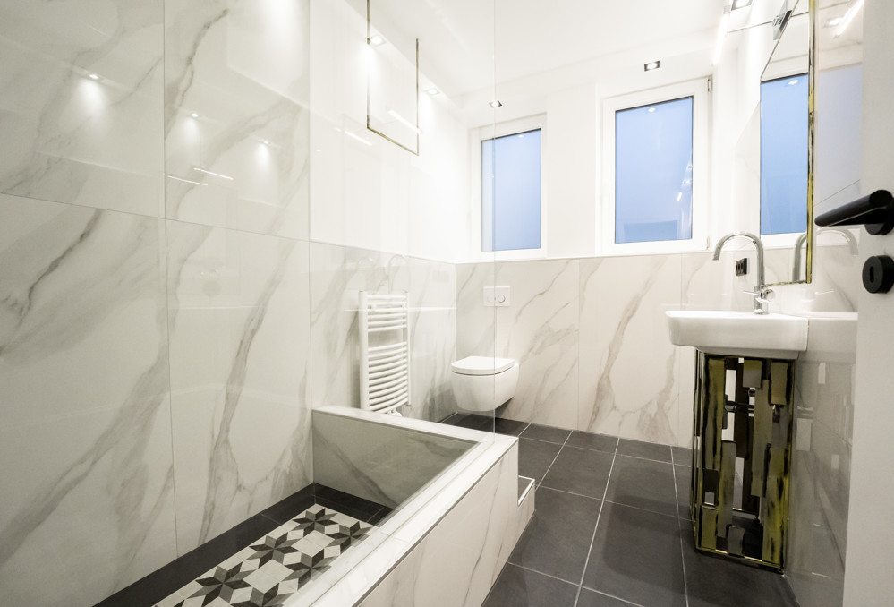 - Böden: Marmor und Feinsteinfliesen, Design-Vinyl Boden