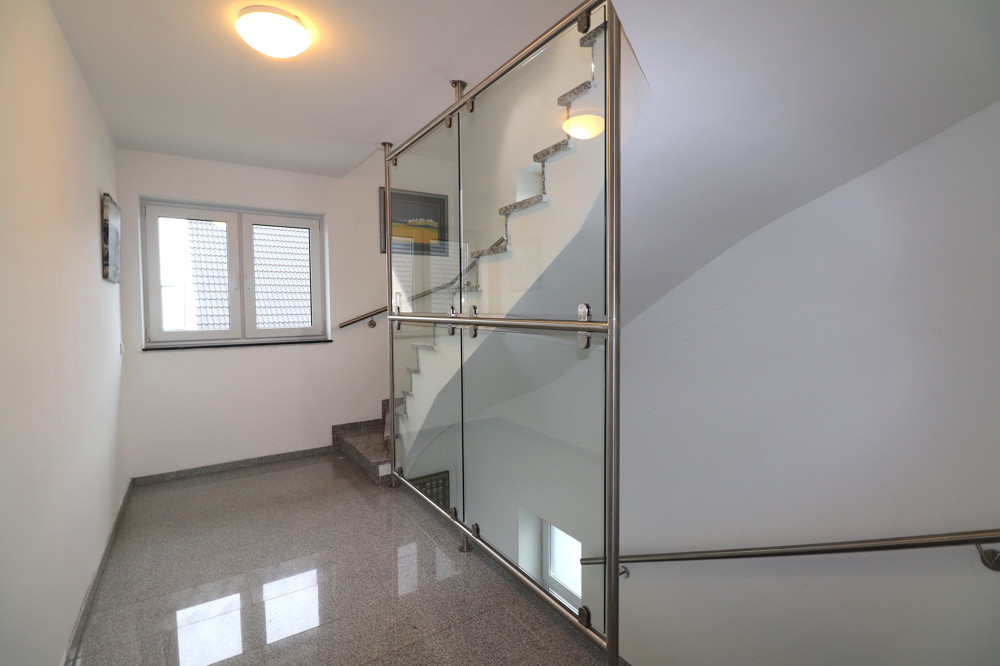 Sie betreten das Einfamilienhaus über einen anthrazit gepflasterten Vorgarten, der 3 Stellplätze, ein Blumenbeet mit Palmen, einer Außenbeleuchtung, sowie einer Garage beinhaltet und befinden sich in einem geräumigen Eingangsbereich mit Abstellkammer. Bis in die dritte Etage wurde grauer Granitboden, schwarze Granit-Fensterbänke und ein aus Stahl- und Glaselementen hochwertiges Treppengeländer verarbeitet.