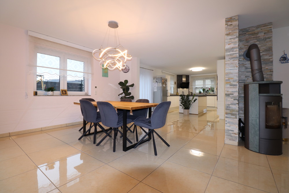 Ein offener Kamin, ebenfalls betont durch eine Rückwand in naturfarbenen Mosaik-Fliesen, verzaubert im Abendlicht die Räumlichkeiten in ein romantisches Zuhause und lädt zu Familienabenden oder Festen ein! . Sie werden bemerken, dass sich die Farbgebungen in dieser Immobilie von dem Außenbereich bis unter das Dach immer widerspiegeln werden.