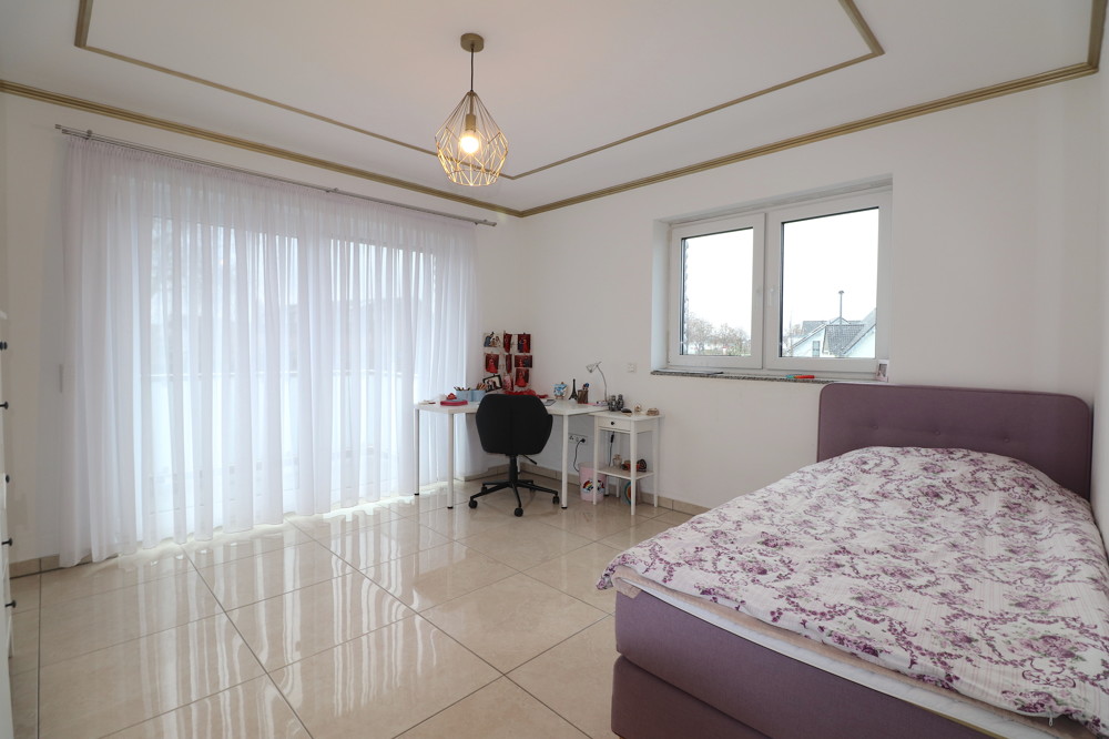 Das Obergeschoss ist einheitlich mit großen beige/grauen Feinsteinfliesen in Mamoroptik versehen. Von der Wohnungstüre aus links ist da Gäste-WC, gegenüber von Ihnen befindet sich ein großzügiges Schlafzimmer, oder - sollten Sie die Einheit separat für sich betrachten - das Wohnzimmer mit direktem Zugang auf den Balkon und einer tageslichterfüllenden Fensterfront. Nebenan befindet sich ein (weiteres) Schlafzimmer mit genügend Stellmöglichkeiten.