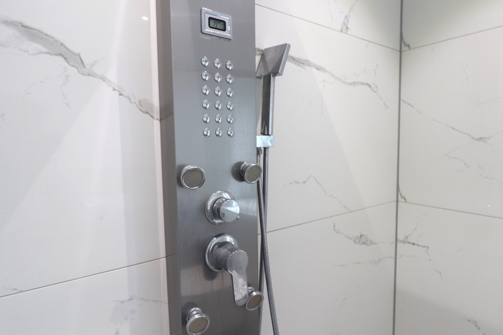 Ende des Flures befindet sich das große Badezimmer, welches ebenfalls mit einer bodentiefe Dusche und Wasseranschlüssen für z.B. eine Waschmaschine ausgestattet ist.