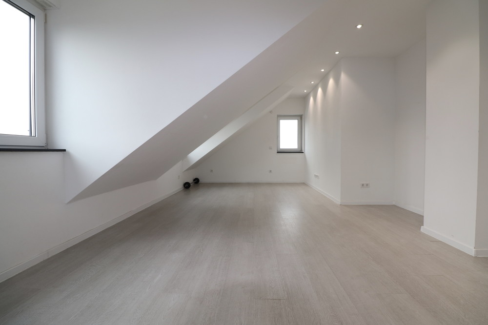Die Wohnung ist einheitlich in beige/grauem Laminat gefliest und der Grundriss ähnelt dem des ersten Obergeschosses sehr.