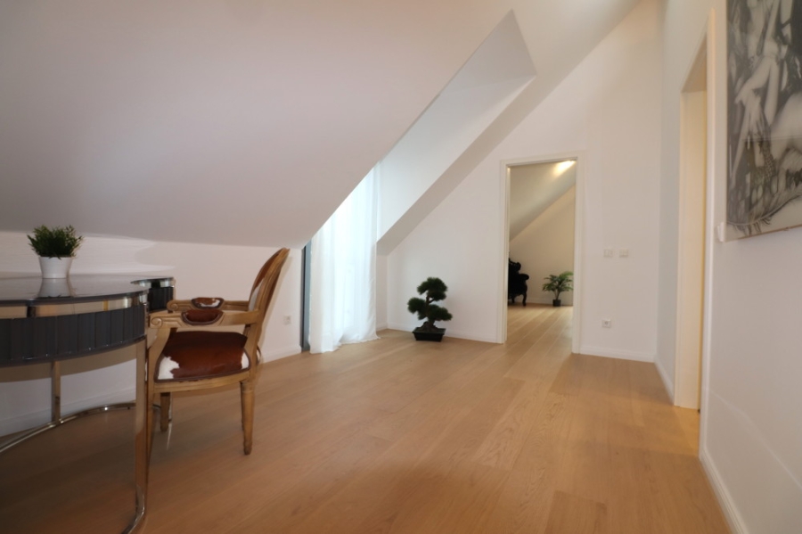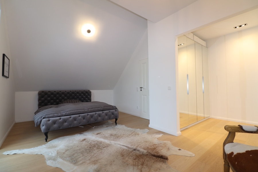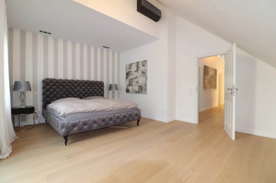 Wohnbereich: heller, großzügiger Wohnbereich mit bodentiefen Aluminium-Fenstern Obergeschoss mit hohe Decken, Schlafzimmer mit neuer Profi Klimaanlage Dual (heizen/ kühlen), neuer hochwertiger Parkettboden, LED Deckenspots im ganzen Haus inkl. Außenbeleuchtung, neue hochwertige Stil-Türen mit Profil Zargen, großzügige Einbauschränke, Fußbodenheizung auf allen Etagen inkl. Untergeschoss