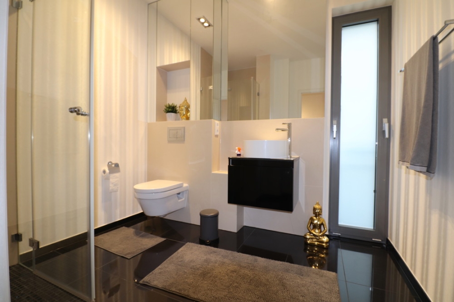 Bäder: hochwertig mit Natursteinböden in Granit Nero Assoluto, große freistehende Oval-Badewanne, hochwertige Markenarmaturen, große Spiegel, Badschränke mit lackierten Oberflächen, neue Echtglasduschkabinen, italienische Grossfliesen (fugenfrei)