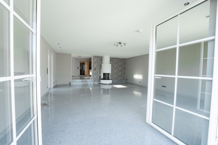 Der Wohn- und Essbereich verdankt sein gemütliches Ambiente dem edlen Kamin, welcher durch LED-Spots zusätzlich beleuchtet wird. Die hochwertige Einrichtung sorgt für ein behagliches Wohngefühl.