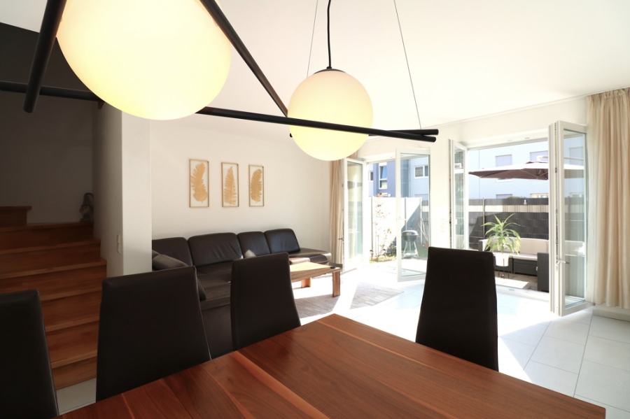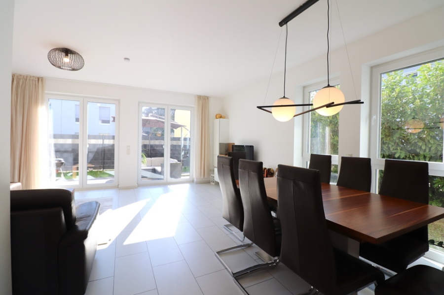 Betritt man das Wohn-/ Esszimmer so wird man empfangen von bodentiefen Fenstern mit Blick auf die Terrasse und angrenzendem Garten, welche den gesamten Raum mit viel Licht füllt.