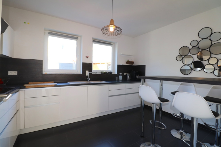 Im Eingangsbereich befindet sich zu Ihrer linken ein modernes Gäste-WC. Direkt dahinter betreten Sie die stilvolle moderne weiße Küche in Hochglanzoptik, welche mit einem Kontrast von anthrazit farbeneben Natursteinboden geziert wird.