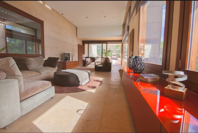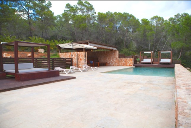 Die Villa liegt idyllisch auf einem Berg umgeben von Wäldern südlich auf der Balearen-Insel Ibiza. Der Strand von Sa Caleta ist leicht erreichbar