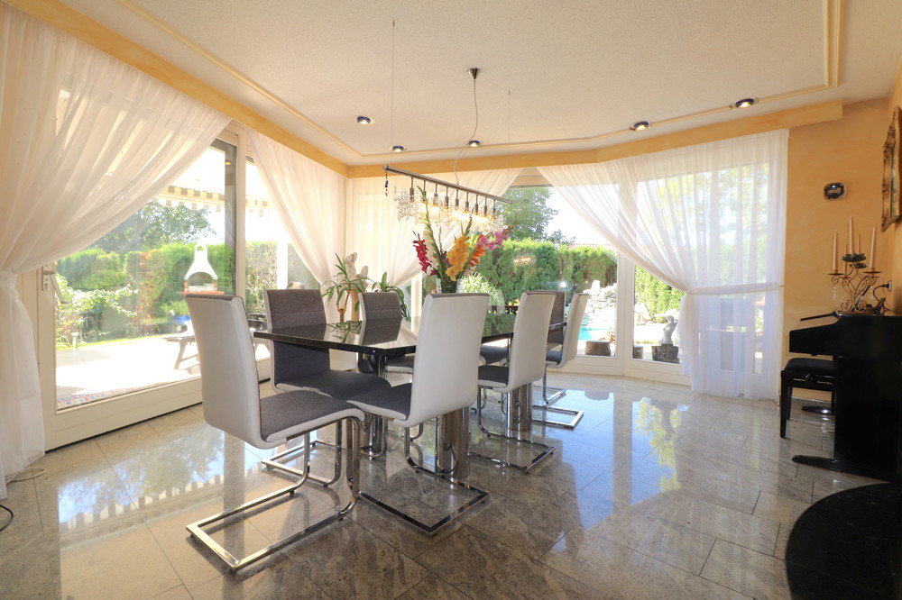 Innerhalb der durchdachten Raumgliederung und der großzügigen offenen Gestaltung, finden sie luxuriöses Wohnen in sieben Schlafzimmern, einem Wohnbereich, Essbereich, vier Bädern, zwei Gäste-WC´s, sowie einem Wellnessbereich mit einer Sauna und Dampfbad. Ein Fitnessbereich ist ebenso vorhanden sowie mehrere Abstellräume und insgesamt drei PKW-Stellplätze. Der Außenbereich überzeugt durch eine traumhafte Gartengestaltung, welche ihre Wirkung nicht verfehlt – einfach entzückend!
