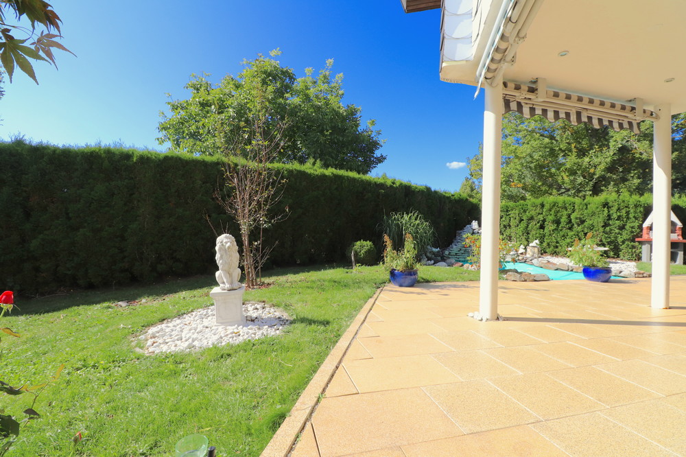 Dort findet sich neben der weitläufigen Terrasse mit einer Grillgelegenheit ebenso ein Teich. Zudem verfügt die Villa über zwei EInliegerwohnungen mit jeweils einem Wohn-/Essbereich, Schlafbereich, Küche und Bad.