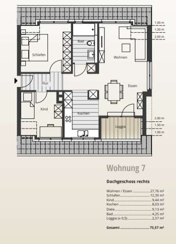 Hervorzuheben ist der großzüge Wohn-, Ess- und Kochbereich der offen gestaltet ist und an den sich die Loggia anschließt.
