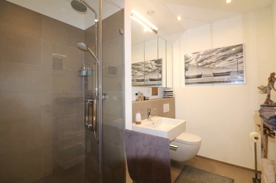Ein weiteres Highlight dieser Immobilie sind zwei moderne Badezimmer mit ebenerdiger Dusche und Badewanne sowie hochwertigen Sanitärteilen. Diese Elemente kreieren separate Wohlfühlbereiche zum Entspannen.