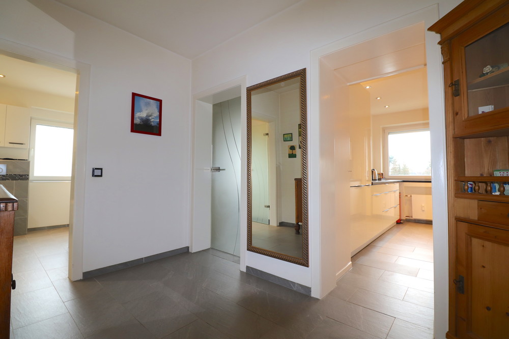 Viel Platz für Stauraum bieten die Einbauschränke zwischen Küche und Flur, welche unauffällig in den Durchgangsbereich integriert wurden.