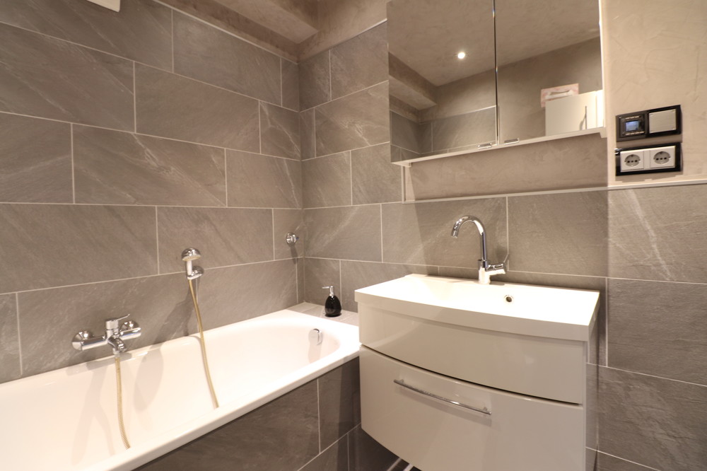 Erst 2014 wurden die Wohnungen aufwendig kernsaniert. Die Böden wurden einheitlich in anthrazitfarbigen großformatigen Fliesen ausgestattet und das Parkett im Wohnzimmer professionell aufbereitet.
