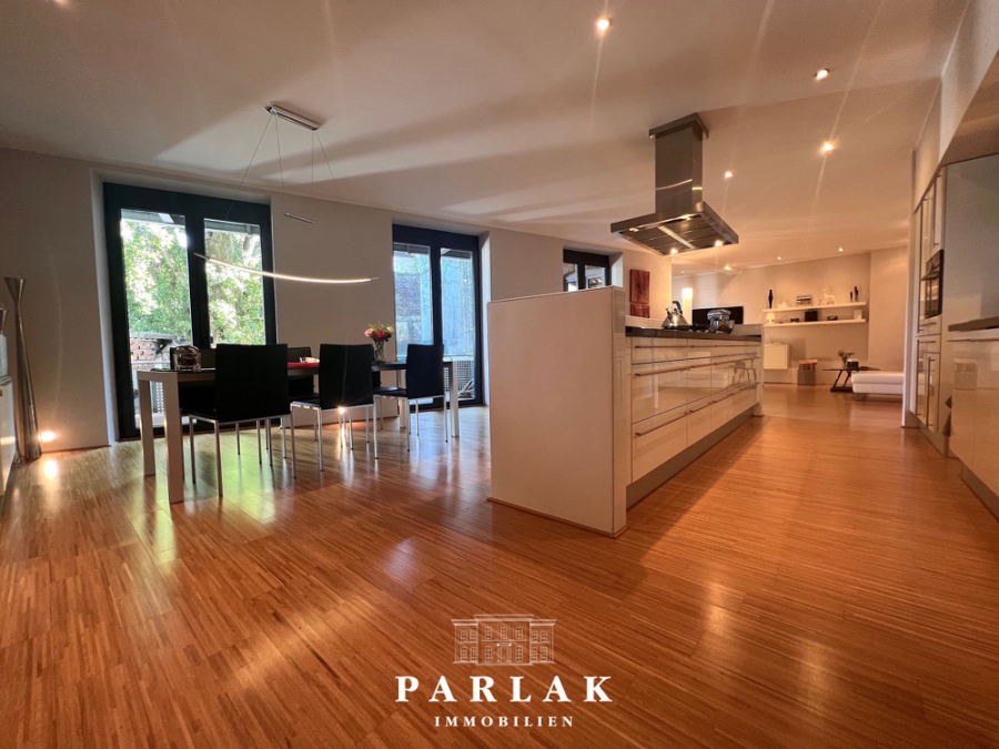 Beim Betreten der Wohnung steht man im Herzstück - dem offenen Wohn-, Küchen- und Essbereich, der Sie begeistern wird. Hier erwartet Sie eine hochwertige Einbauküche in glänzendem Hochglanz-Design, die den Raum zum Strahlen bringt. Die Einbauküche ist mit einer Kochinsel, einem Gas-Kochfeld und einem integrierten Lavasteingrill ausgestattet, was das Kochen zu einem besonderen Erlebnis macht.
