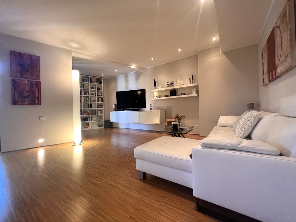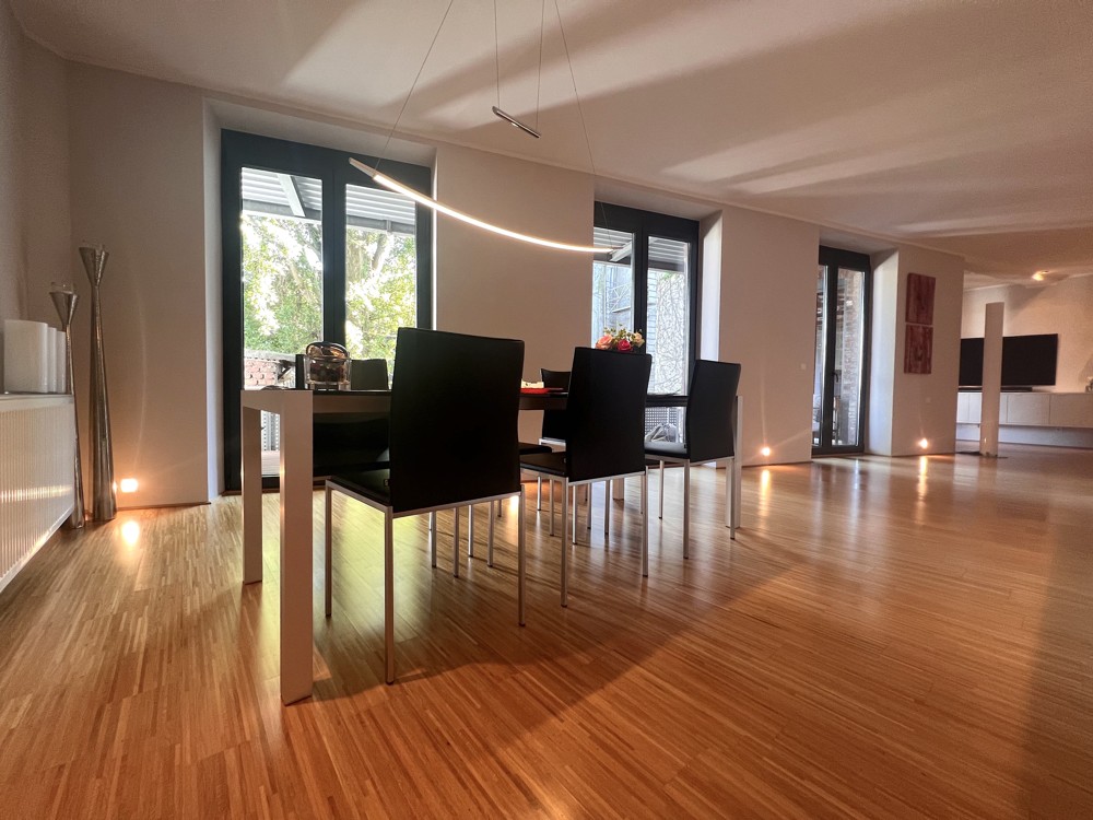 Der offene Grundriss und die hohen Decken verleiht der Wohnung einen einzigartigen Wohlfühlcharakter. Der Wohnbereich ist lichtdurchflutet und bietet einen direkten Zugang zur südlich ausgerichteten Terrasse. Die besonders großen Fenster sorgen für eine helle und freundliche Atmosphäre.