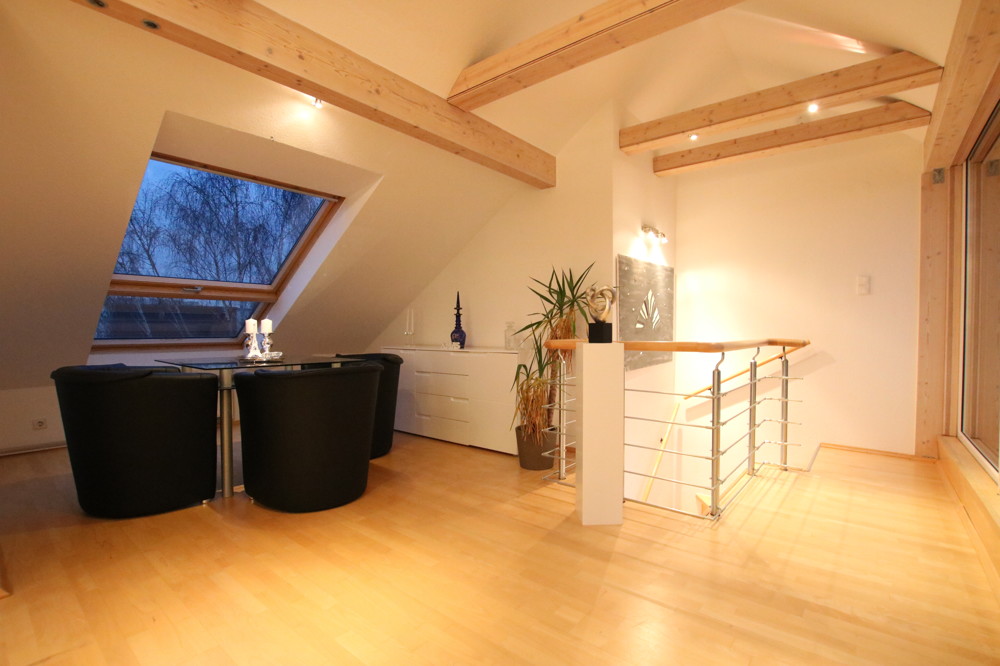 Diese exklusive lichtdurchflutete Maisonette-Wohnung mit Penthouse- Charakter, erstreckt sich über das dritte Obergeschoss und vierte Obergeschoss eines im Jahr 1957 errichteten Mehrfamilienhauses. Sie betreten die Wohnung über die geräumige Diele und gelangen in die Wohnküche mit Essbereich. Die Küche ist mit modernen Geräten ausgerüstet. Auf derselben Ebene finden Sie das Hauptschlafzimmer mit Balkon, ein Kinder- oder Gästezimmer sowie ein modernes, neuwertiges Tageslichtbad mit Stellplatz für Waschmaschine und Trockner. Über die elegante Wendeltreppe kommen Sie in