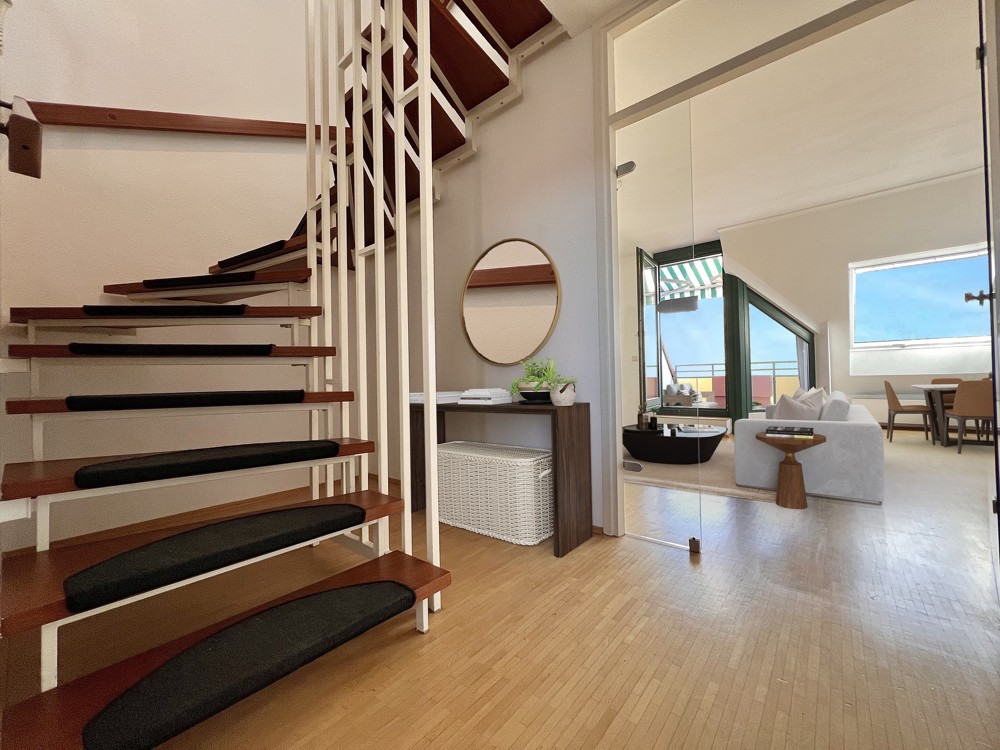 Über eine Wendeltreppe gelangen Sie in den großzügigen Schlafbereich mit Bad én Suite.