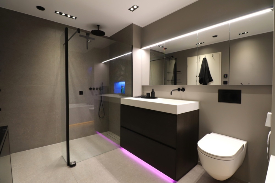 Das Masterbad verfügt ebenfalls über luxuriöse Sanitärobjekte von Antonio Lupi. Das Waschbecken, sowie die Shampoo Ablage sind mit indirekter Beleuchtung versehen. Zur linken befindet sich eine bodentiefe Rainshower Dusche und zur rechten eine moderne Badewanne inklusive LED Beleuchtung, welche zum entspannen einlädt.