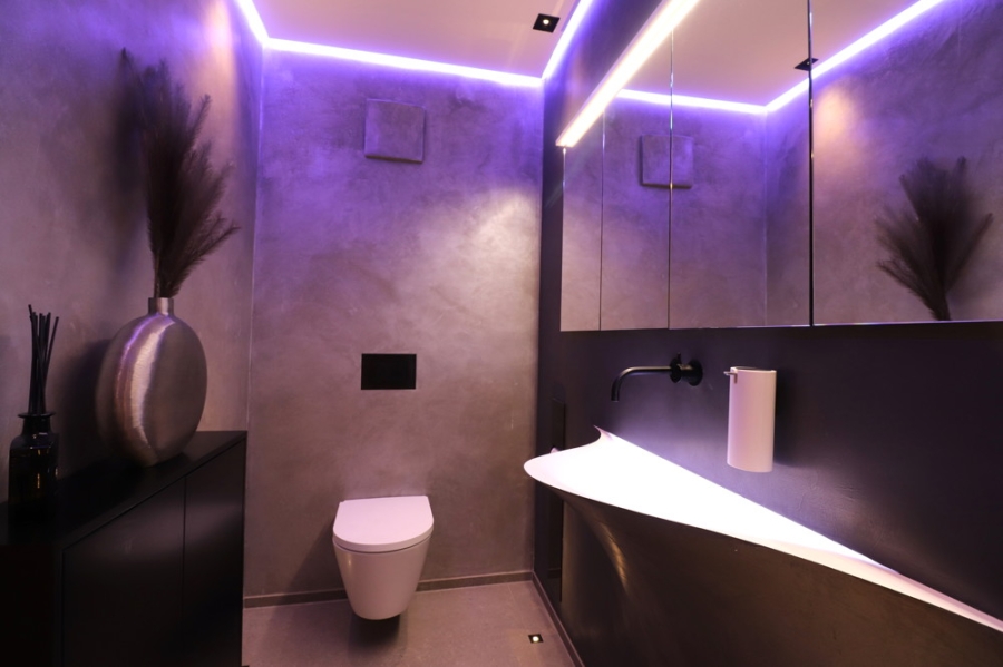 Das angrenzende Gäste-WC besticht durch das einzigartige Design. Die Wände wurden in einer Spachteltechnik in Beton-Optik verputzt. Das Designer Waschbecken steht für einen außergewöhnlichen Look und besticht durch Einzigartigkeit. Alle Armaturen sind in schwarz-matt gehalten. Der integrierte Spiegelschrank, sowie indirekte LED Beleuchtung und Spots an Wänden und Boden wirken harmonisch und beruhigend.