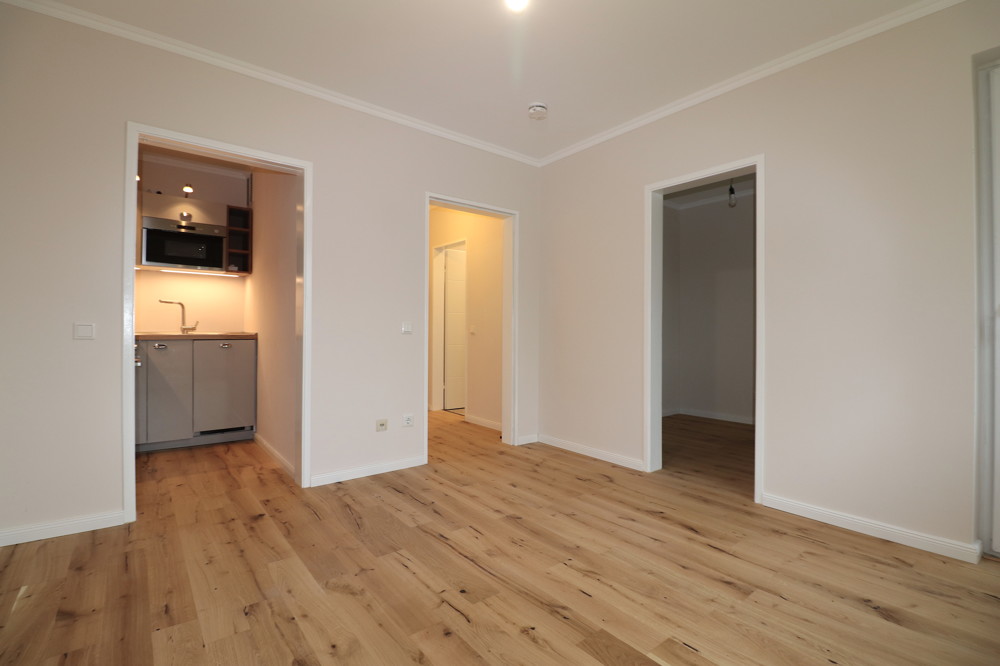Diese frisch sanierte 2-Zimmer-Wohnung besticht durch einen offenen Grundriss, der ein weites Raumgefühl erzeugt. Auf ca. 30 m² stehen Ihnen dadurch ein großzügiger Wohn-/ Essbereich, mit offener und eine vollausgestattete Einbauküche besitzt und Zugang zum ruhigen Balkon gewährt, sowie ein Schlafzimmer und ein modern designtes Duschbad